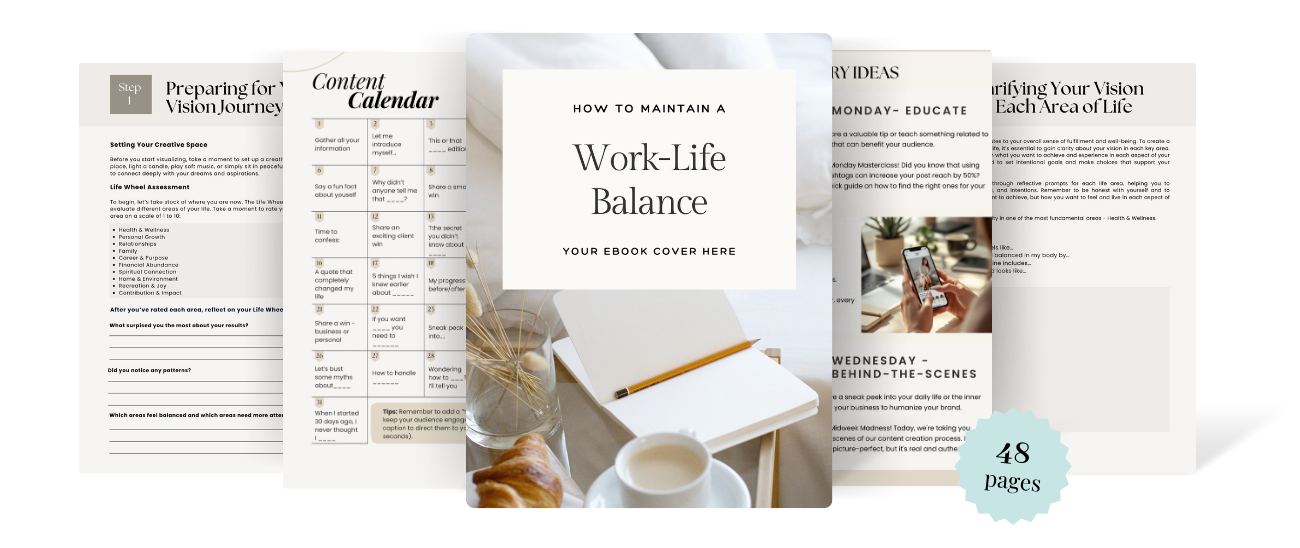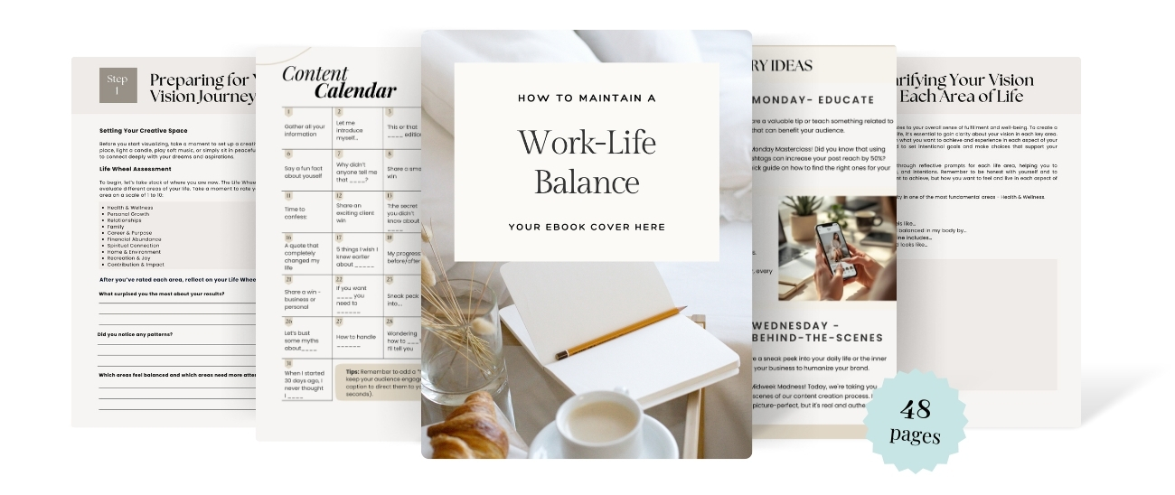 This 48–page Work–Life Balance Ebook gives you practical steps, reflection prompts, and real routines that help you build a life that feels grounded and enjoyable; without quitting your goals or slowing your momentum.